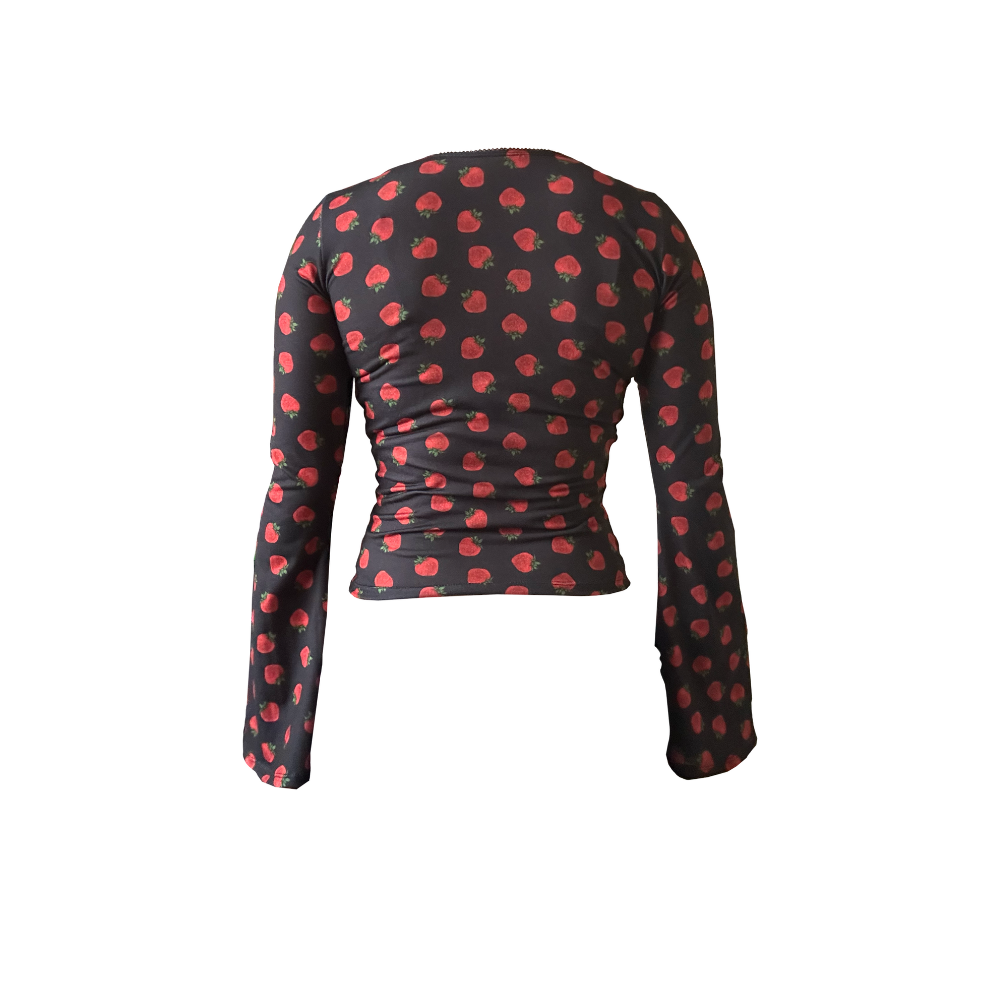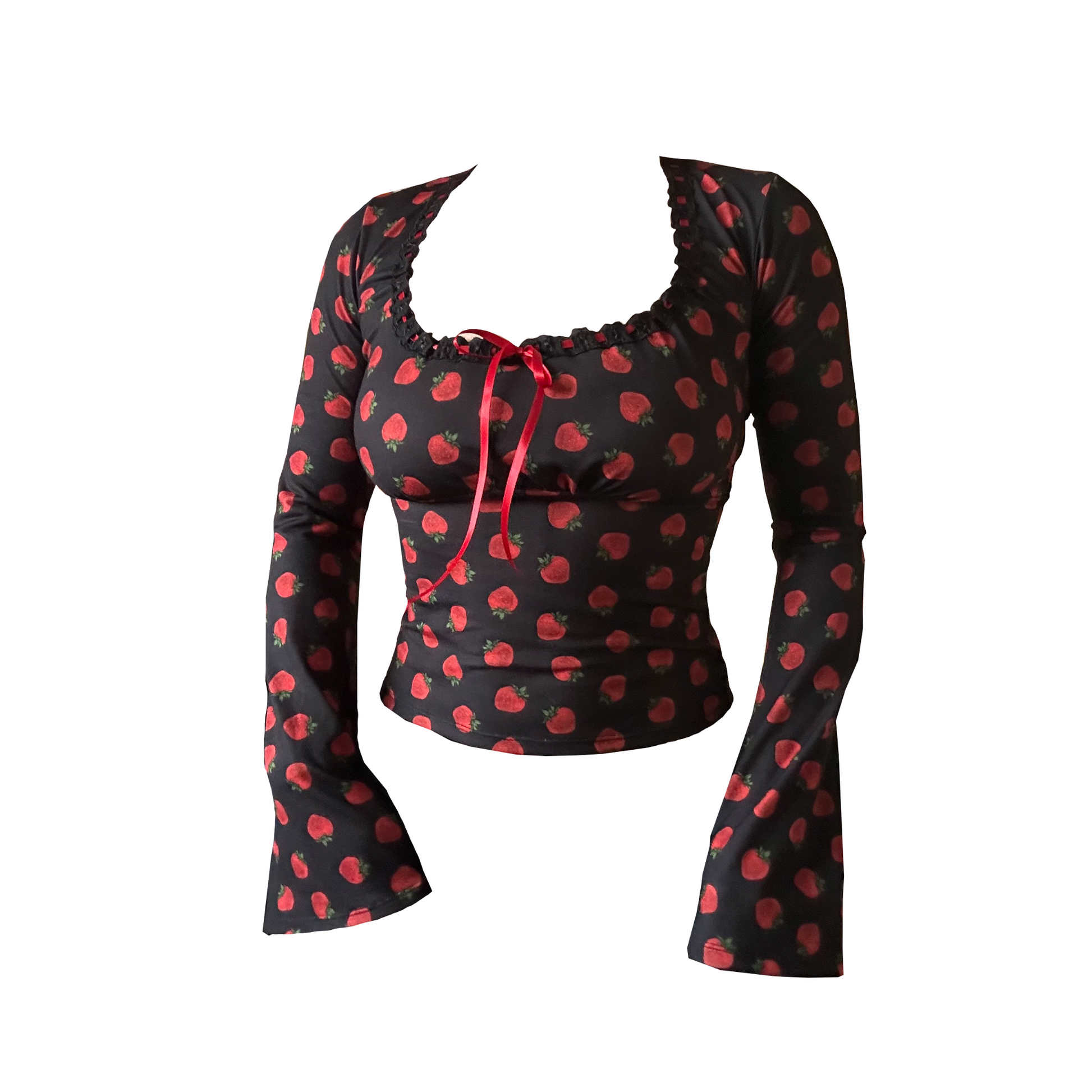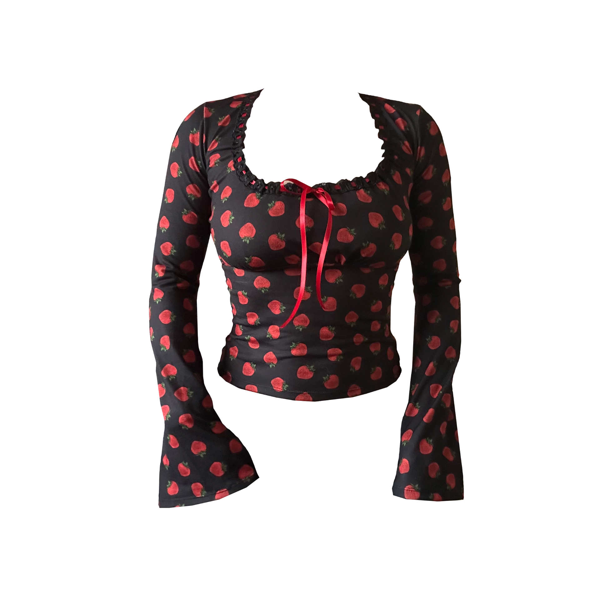 Designed with the cutest strawberry print fabric and dreamy bell sleeves.