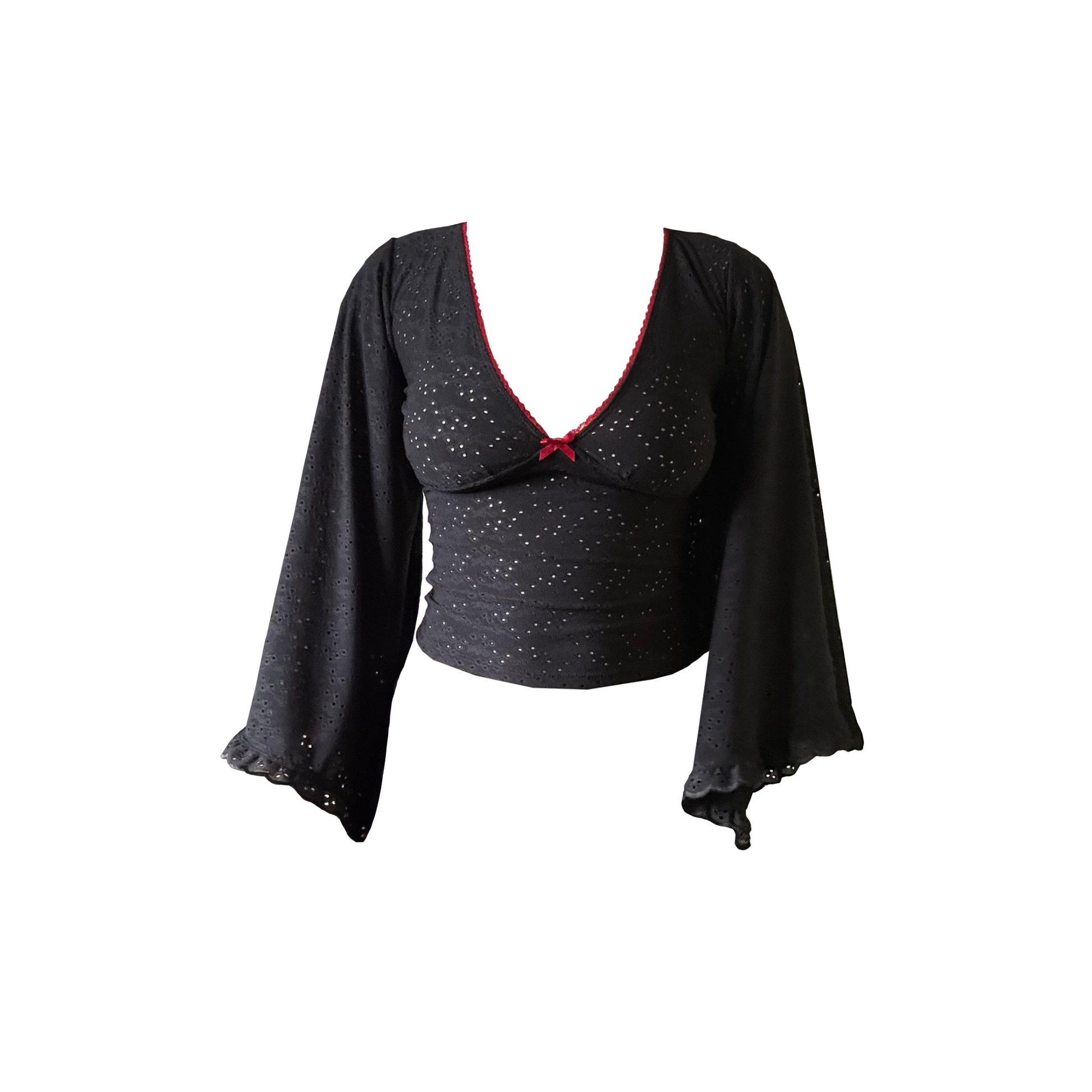 Designed with soft, broderie anglaise eyelet fabric and dreamy bell sleeves, this piece brings a touch of witchy wonder to your wardrobe.